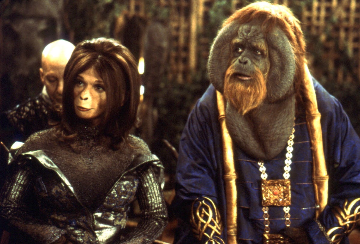 At one point, while the humans are running for freedom, Burton has them run through a series of ape bedrooms, with each ape engaging in extreme human behaviors (flirting with their husband, taking off a wig). It’s hard to think of a reason for these scenes, other than Burton thought they were funny and pleasant in an odd sort of way.