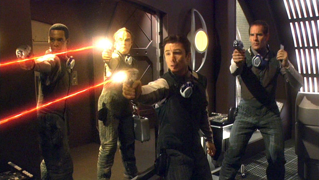 A farmer shoots an alien running through his field — and it’s a Klingon! The first episode of Enterprise starts things off by trying to ground the world of Earth we know today with a projection of only 100 years in the future. The plot is a bit wonky, and the shape-shifting enemies, the Suliban, won’t necessarily make a whole lot of sense later, but the vibe of this episode is great. If you can’t handle Captain Archer’s (Scott Bakula) “NX-01” baseball cap and the syrupy theme song, you’re not gonna like the rest of the show. Strap in! It’s gonna be a long (short?) road.
