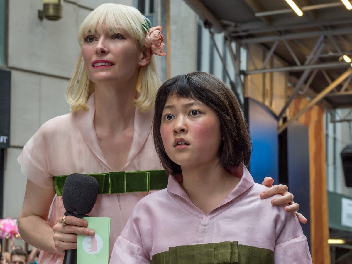 With energy and atmospherics that resemble those of a deranged carnival, Okja draws us in and pushes us away at the same time, with the “kind of our reality, but not quite our reality” tension sci-fi so delights in exploring. In 2007, the Mirando Corporation announces a new breed of “big pig,” engineered to leave a minimal environmental footprint, live extremely long, and “taste fucking good” — or so says haughty CEO Lucy Mirando (Tilda Swinton). Of the 26 pigs sent to farmers around the world, one ends up in South Korea, where tween Mija (Ahn Seo-hyun) lives with her grandfather.