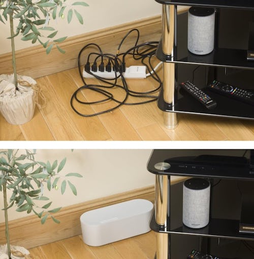 This cable management box is a must-have for those situations where having a mess of cables sitting out in plain sight is unavoidable. Ventilation holes on the top help keep power strips from overheating, while multiple slots in the back let you thread cables through as needed. Choose from three colors: black, white, or white with a faux wood top.