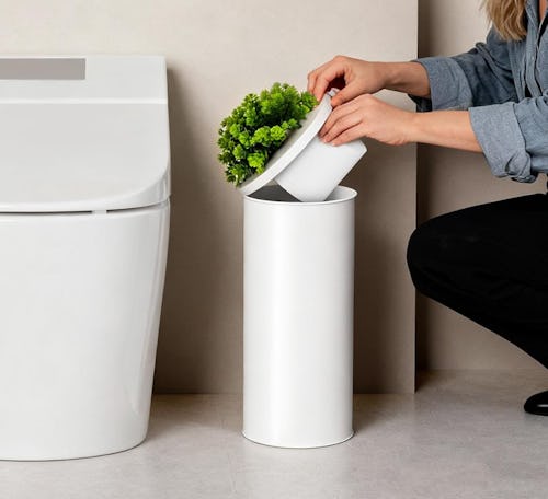 Leaving toilet paper sitting out on your counters rarely ever looks good, so why not stash them inside of this holder instead? There’s enough room inside to store up to three rolls. Plus, the lid even features a faux plant to give your bathroom a nice pop of greenery.