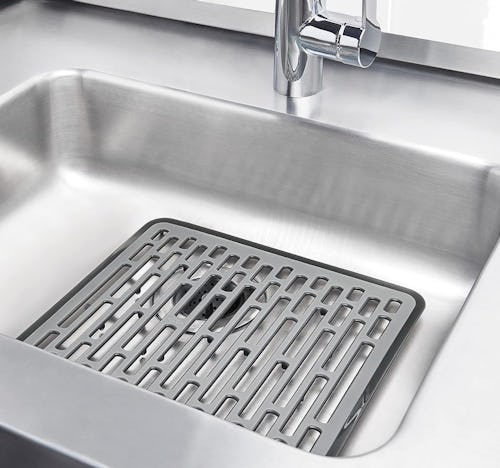 This sink mat is made from durable silicone that protects sinks from scratches and chips caused by heavy cookware. At 11.5 by 12.25 inches, it fits small sinks perfectly, and features four small feet on the bottom to elevate for drainage. Plus, the slotted design helps promote airflow for quicker drying.