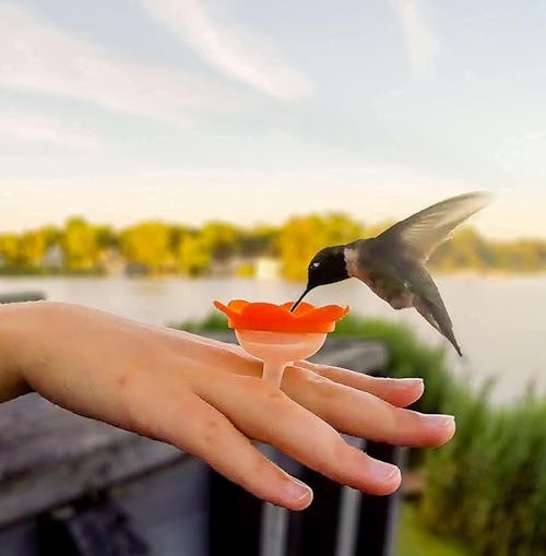 This hummingbird ring feeder is a clever way to have a close encounter with these tiny, majestic creatures. The ring is made to mimic the look of a real flower, with a small perforation in the center for their beaks. Just remove the petal-shaped cap, fill the well with sugar water, and sit still with the ring on your finger as your feathered friends investigate.