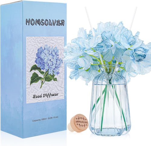 For anyone who loves to make a statement with their home fragrance, this aromatherapy reed diffuser set is a winner. It comes with a tinted glass vase filled with sea salt and sage-scented oils, plus six reed diffusers. What sets this set apart from similar options are the attractive faux blooms attached to the reeds for a chic bouquet effect.