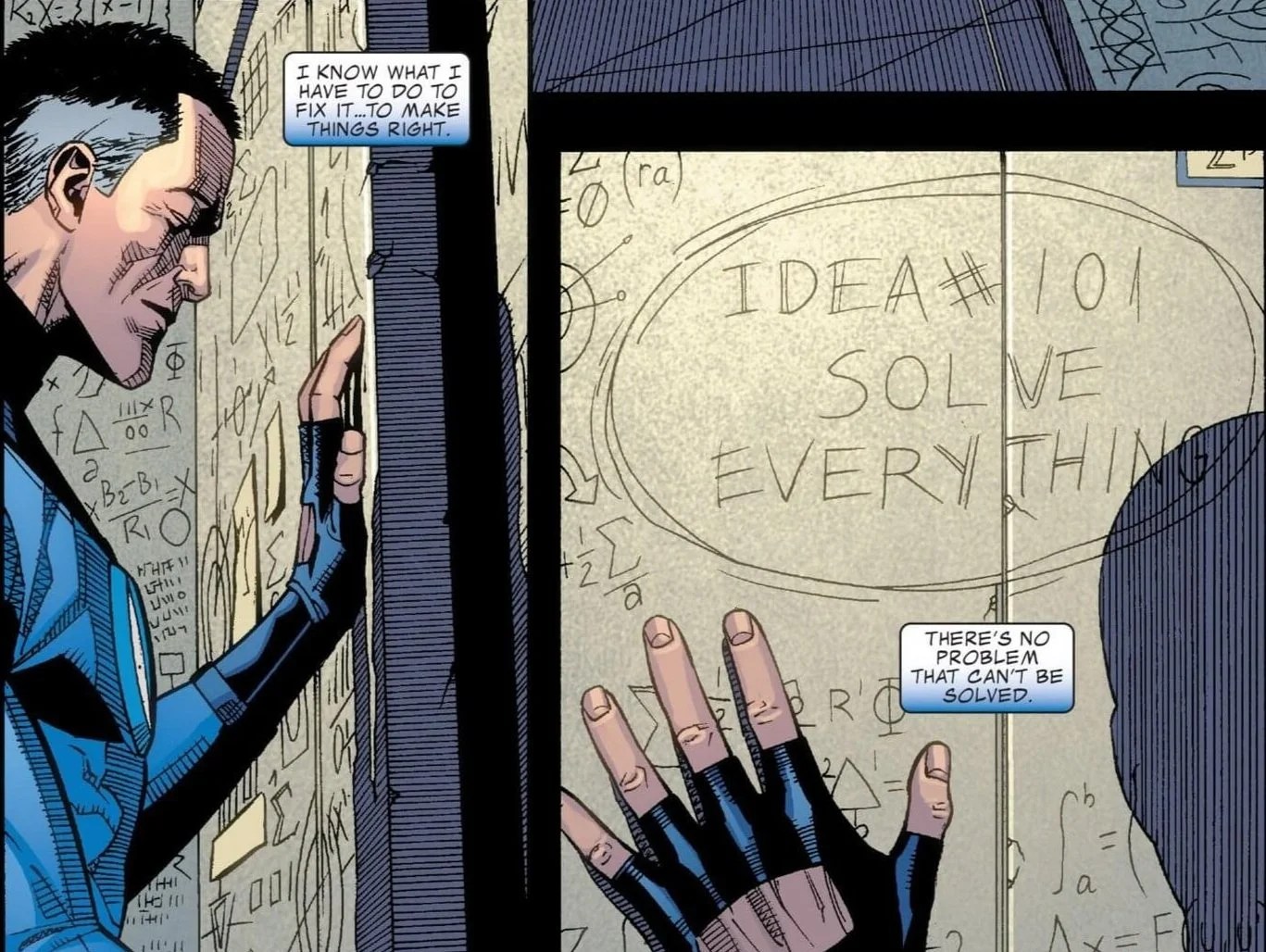 Doomsday could even take it a step further and give us a version of Reed’s “solve everything” mantra (which was already used on pieces of First Steps merchandise, despite not actually being in the movie). In the comics, Reed uses whatever surface is available to him to work out the logistics of how to solve all of the world’s problems — poverty, hunger, war, and the like — even as those around him think it is virtually impossible. Initially introduced during the Dwayne McDuffie-penned run of Fantastic Four, the concept flourished in some unexpected ways once Jonathan Hickman took over the title, leading to the introduction of the multiversal Council of Reeds.
