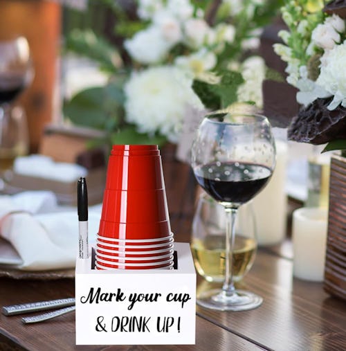 Don’t leave those party cups sitting in a stack on your drink table. Instead, place them in this holder. It’s made from solid wood, with extra space where you can place a marker so that people can label their cups. And, conveniently, it works just as well with those ubiquitous red plastic cups as it does with paper coffee cups, plastic shot glasses, and more.