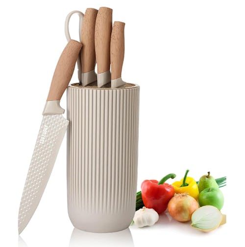 This stylish set of knives is sure to look good sitting out on your countertop. Not only is each knife made from rust-resistant stainless steel, but the blades also feature a unique star texture that helps keep ingredients from sticking to them. Choose from two colors: khaki or black.