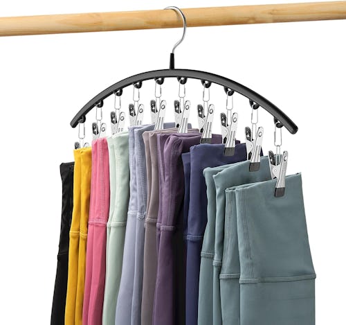 A space-saving hanger that can hold up to 10 pairs of leggings