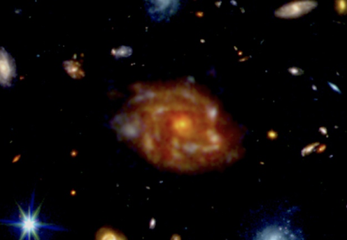 It’s located in an unusually crowded region of space, where galaxies are packed closely together, ten times denser than typical areas of the universe. This dense environment likely provided ideal conditions for the galaxy to grow quickly. It probably experienced mergers that were gentle enough to let the galaxy maintain its spiral disk shape.
