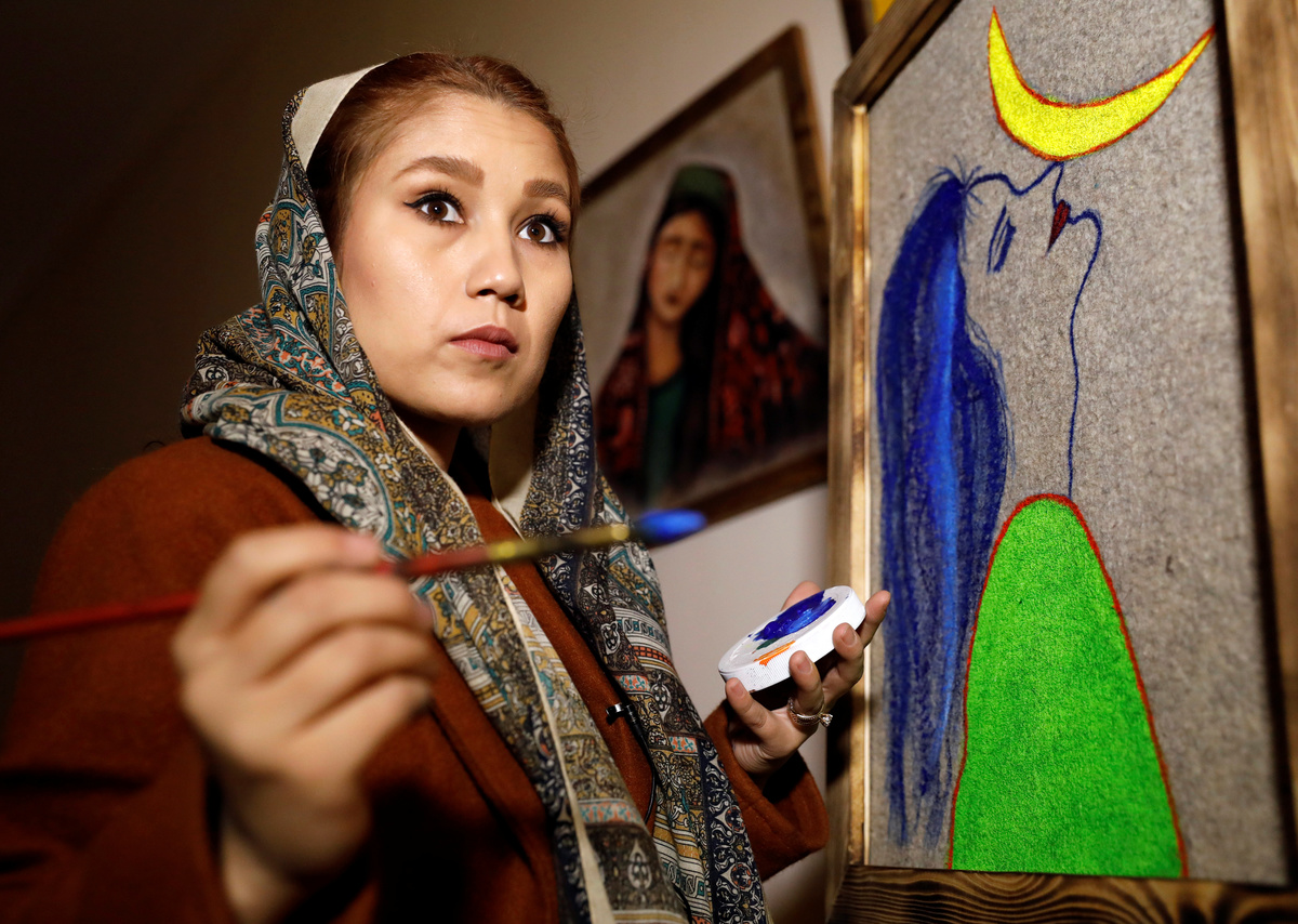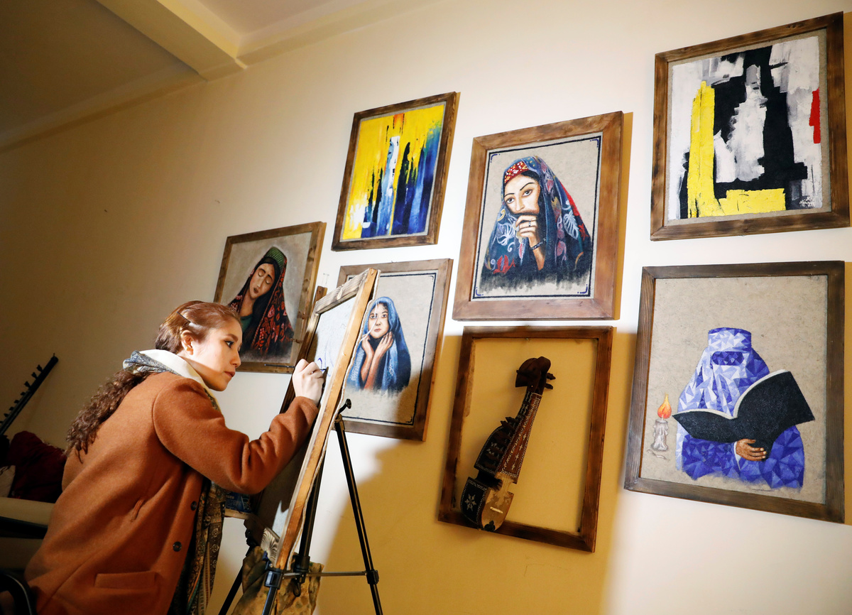 In a small art gallery in the Afghan capital, Marzia Panahi watches as one of the young artists she has just employed applies paint to a framed felt canvas propped up against a easel.