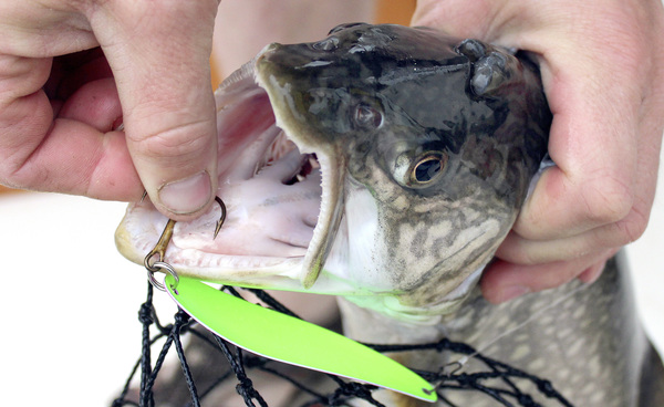Each angler is permitted two lines, so Bambenek, working alone, began playing out eight lines trailing spoons or minnow-imitation plugs for the four of us on board. Some lines ran just below the surface, some on downriggers as deep as 40 feet.