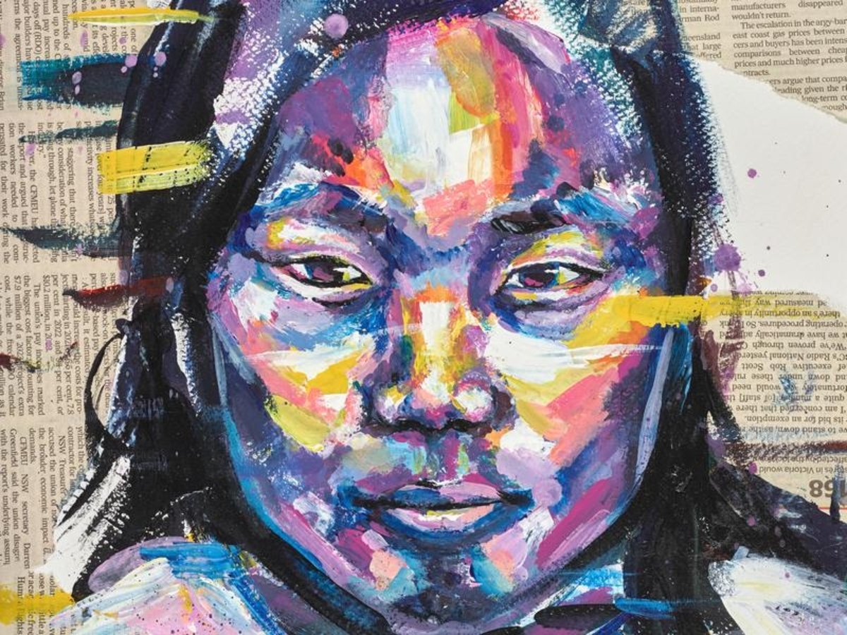 The portrait features collage in the form of newspaper strips that frame the subject's face, alluding to Jessica's love of reading and writing.