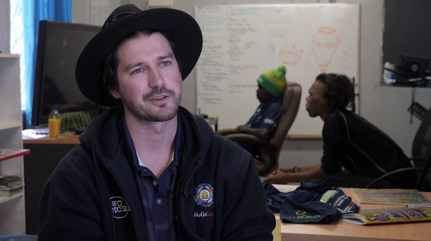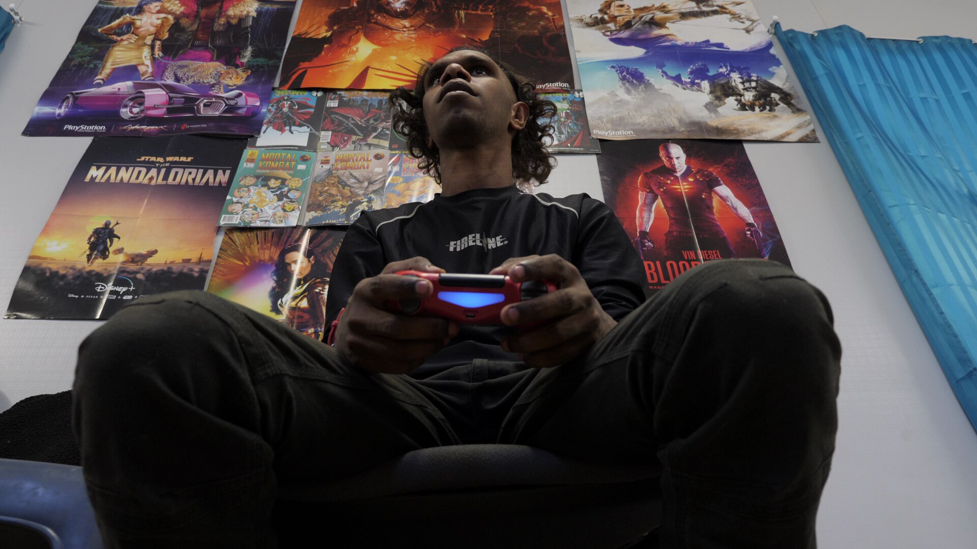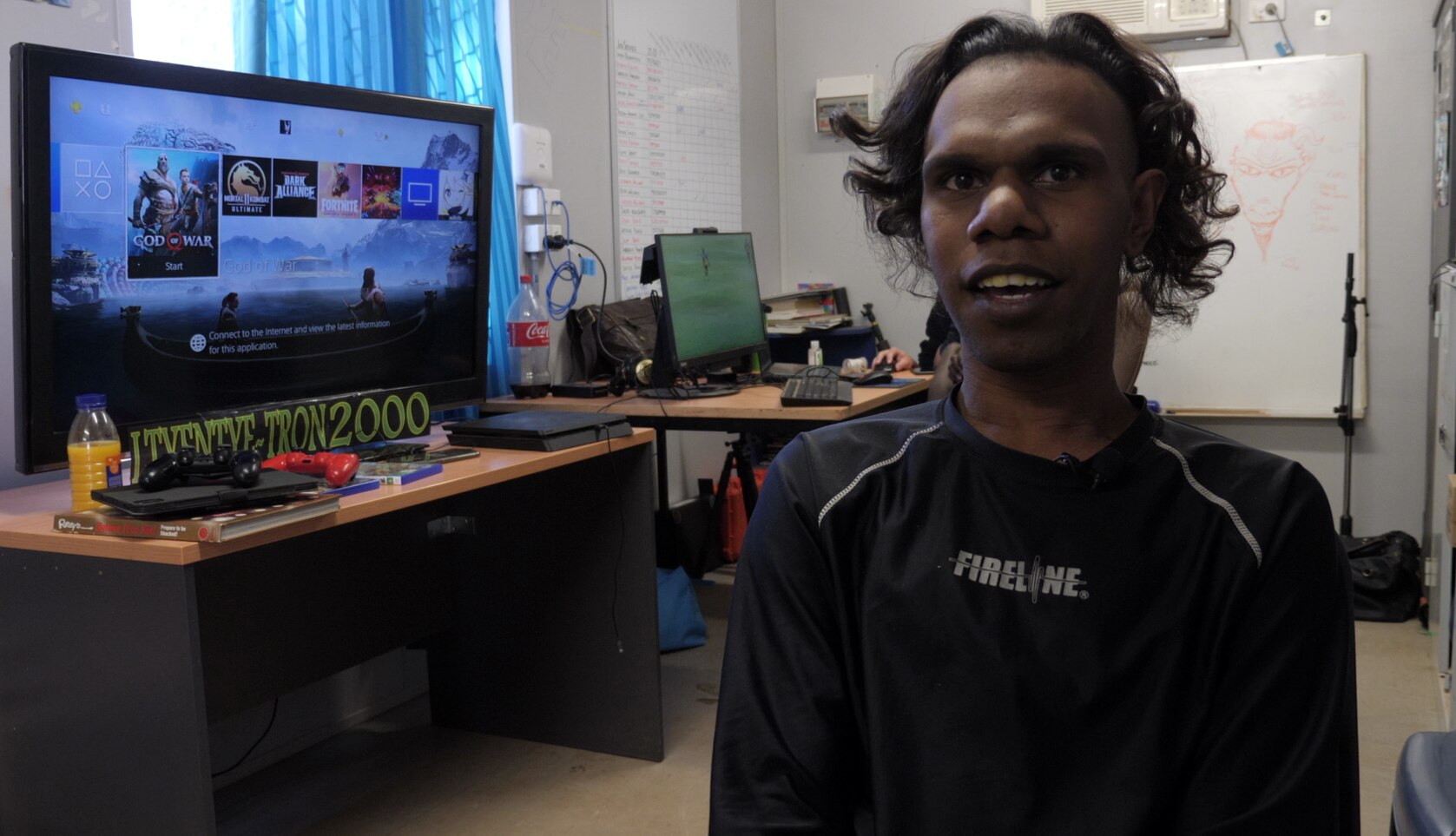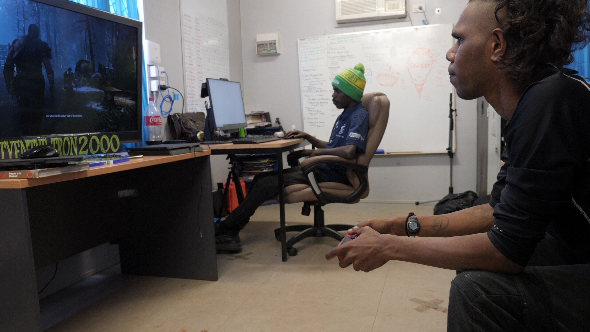 Checkpoint Ltyentye is filmed in the community's 'media hub', a small demountable equipped with a TV, computers for editing, and room for a console or device to play games on.