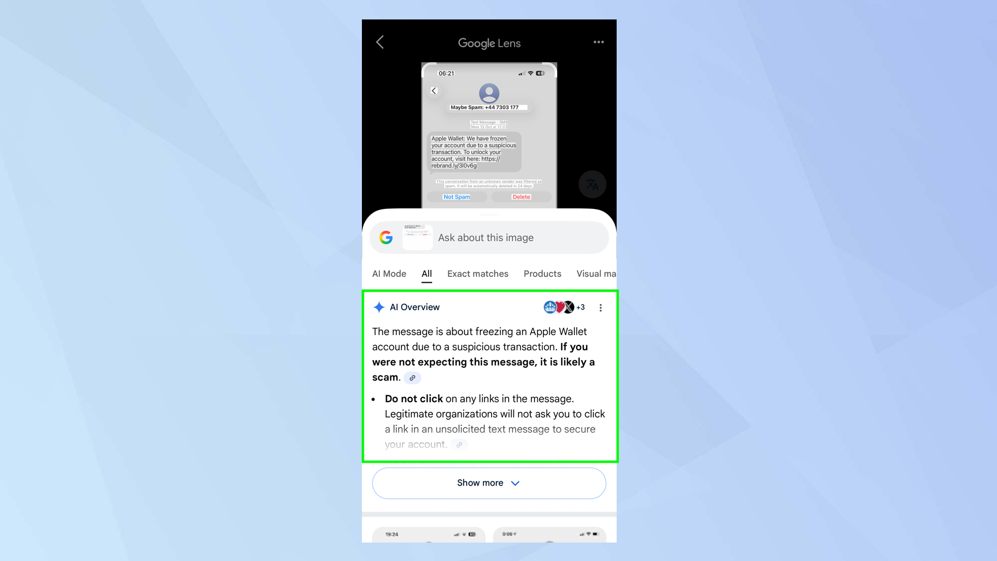 Now select the screenshot and Lens will work its magic, using AI and information on the web to assess the message and inform you of any potential problems.