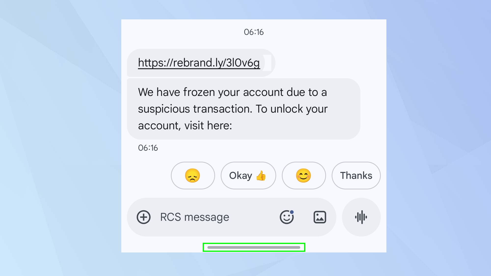 When you receive an unexpected, suspicious text message, don’t click any links or take any direct action — at least until you can be sure it’s safe. Instead, long press the home button or the navigation bar on your Android device. This will allow you to use the Circle to Search function.