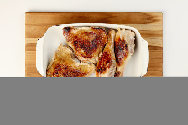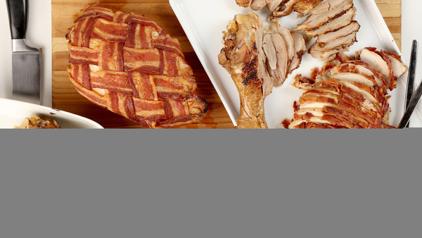 While the legs braise, roast the breasts: Make a couple of bacon mats to cover the breasts. Weave slices of bacon as you would strips of dough for a lattice pie crust. Sprinkle the breasts with salt and pepper, then cover each with a bacon blanket. Roast side by side in a 375-degree oven to an internal temperature of 165 degrees, about an hour. Remove from the oven and rest on a cutting board for about 15 minutes before slicing.