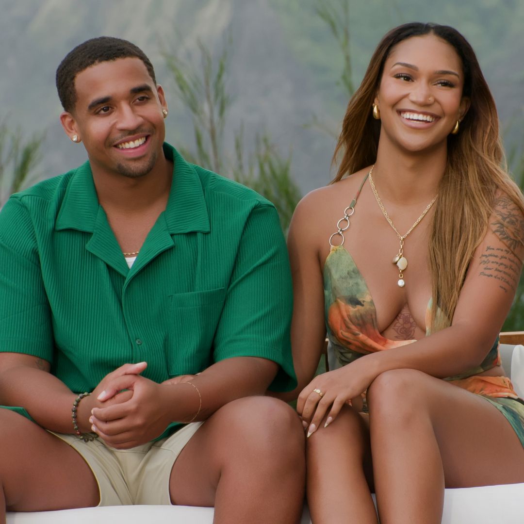 Mikey Bivens and Sydney McGregor sit together on a couch smiling in a still from temptation island season 2.