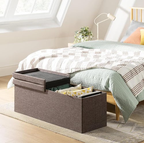 This stylish and doubly functional ottoman isn’t just for sitting; it also acts as a lovely storage space. It has foam padding for a plush seating experience and a smart lift-top design that opens from both sides for easy access. It’s incredibly easy to set up and fold away into a compact unit when not in use.