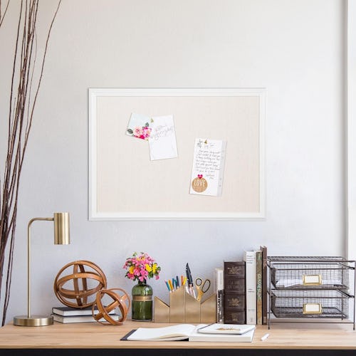 Use this chic linen bulletin board to collect ideas and inspirations with style. Featuring a white wood-style frame and an elegant linen surface, this board effortlessly combines functionality with flair. Complete with two push pins and easy-to-follow mounting instructions, it sets up in no time, allowing both vertical and horizontal orientation. The dense backing material ensures a clean look, holding push pins firmly while hiding pinholes after use.