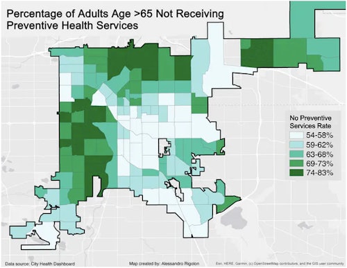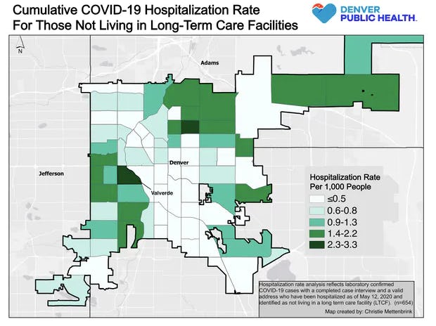 In Denver, neighborhood maps also reveal other influences. For example, maps of COVID-19 hospitalizations overlap with maps showing lack of health insurance and access to preventive medical care.