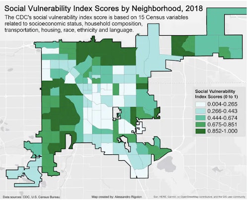These inequities have contributed to vast differences in levels of social vulnerability — the constellation of individual and environmental circumstances that weaken a community’s ability to prepare for and respond to crises like this pandemic. Mapping scores on the CDC’s Social Vulnerability Index in Denver reveals how these clear patterns of disadvantage coincide with COVID-19 hospitalization rates.