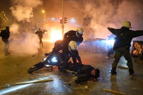 The violence came during a march by several thousand people in the southern Nea Smyrni district. Greek media said dozens of people attacked a motorcycle police officer with stones and clubs, severely injuring him.