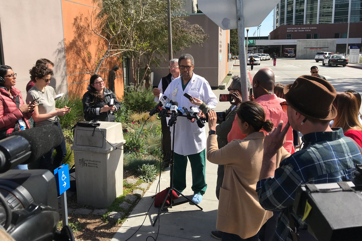 One of her three victims, a man in his 30s, remained in San Francisco General Hospital in serious condition on Wednesday, the hospital said. Two others were released Tuesday night, it said.