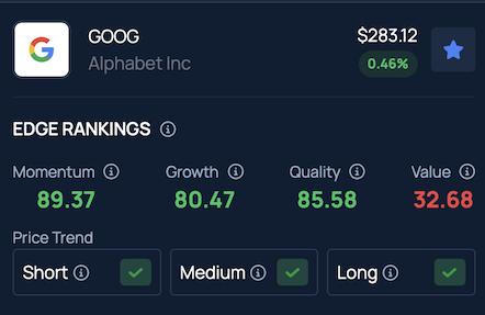 Benzinga's Edge Stock Rankings place GOOG in the 89th percentile for Momentum, highlighting the stock's strong long-term price performance. Click here to see how it compares with its peers.