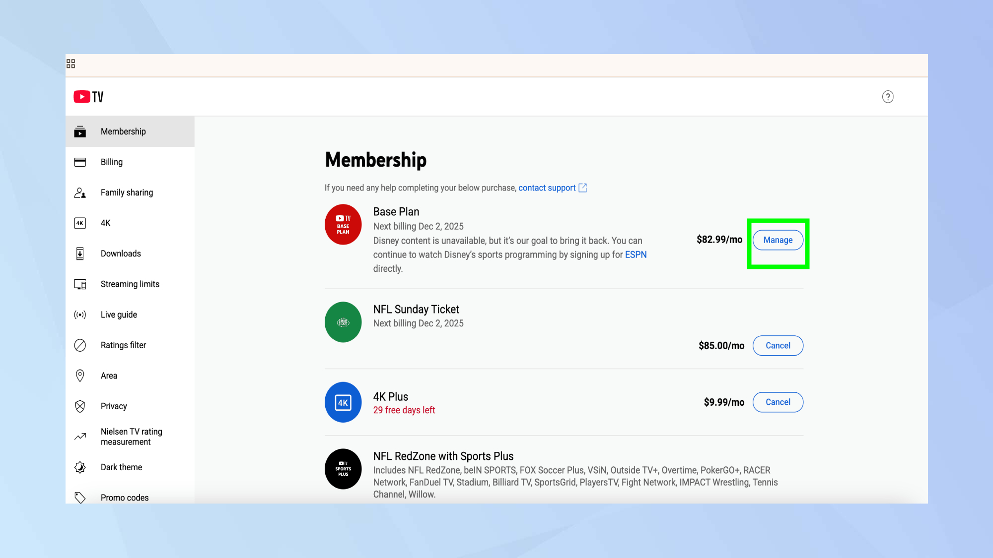 Next, click Membership and then Manage. If you're eligible for the discount, you should see the $10 monthly credit applied to your bill.