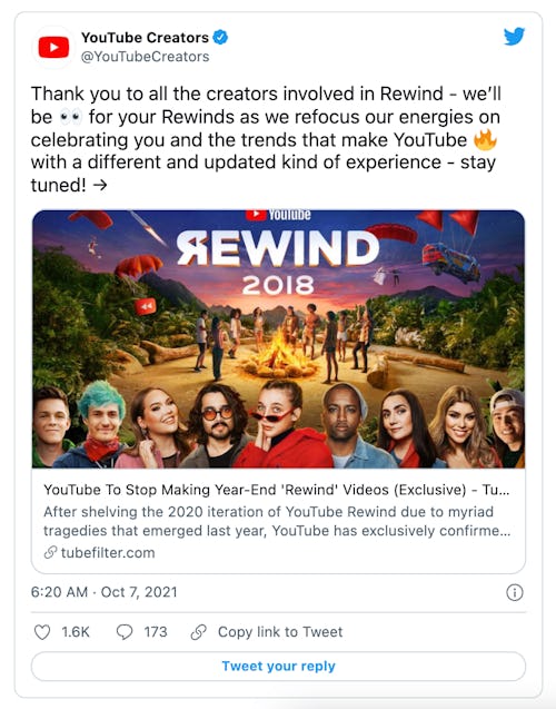 YouTube has permanently canceled Rewind, its annual year-end round-up of popular creators, trends, and most popular videos on the site. The company had already canceled 2020’s Rewind due to the pandemic and says it will now refocus its energy on celebrating creators “with a different and updated kind of experience,” on Twitter.