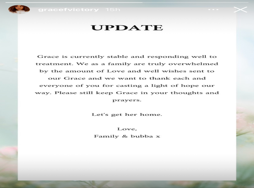 On 30 December, the family shared a second post on her Instagram page, saying: “Grace is currently stable and responding well to treatment.”