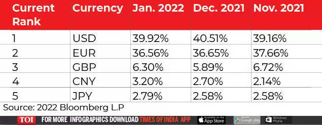The dollar kept its top spot in January, a position it’s held since June, even though its market share fell to about 39.9% from 40.5% in December. The euro also lost ground but held onto second place, while the British pound and yen rounded out the top five in third and fifth place, respectively.
