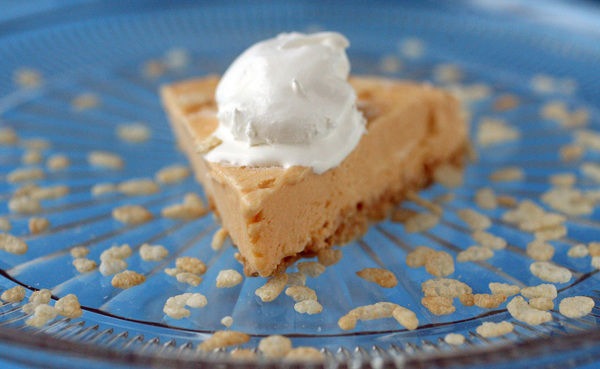Two things make this dessert great, and both of them are peanut butter. One is the way peanut butter goes so blissfully with butterscotch, even when it is fat-free, sugar-free, instant butterscotch pudding mix. And the other is the incredibly resourceful crust made from peanut butter, honey and Rice Krispies.