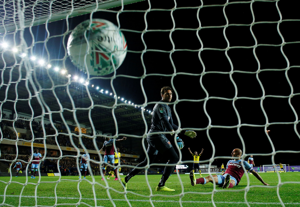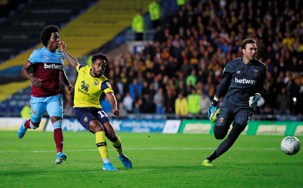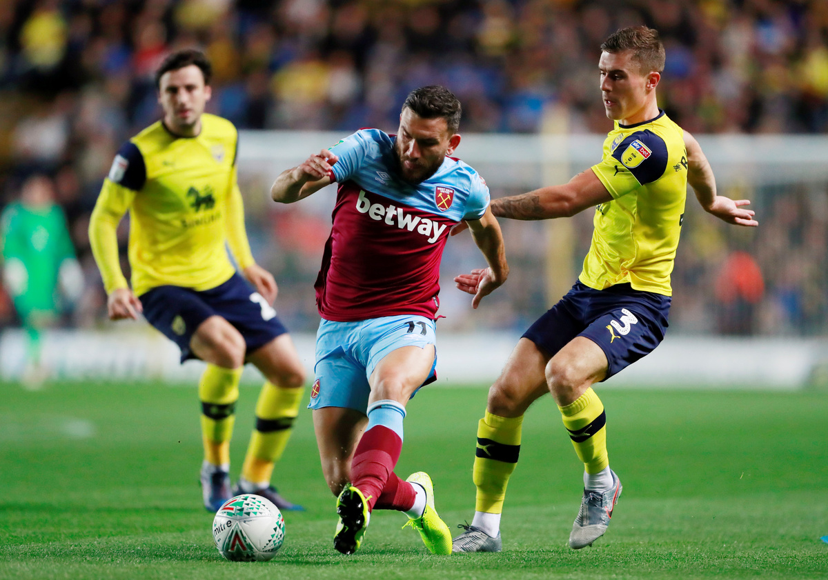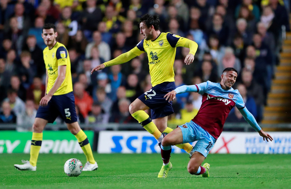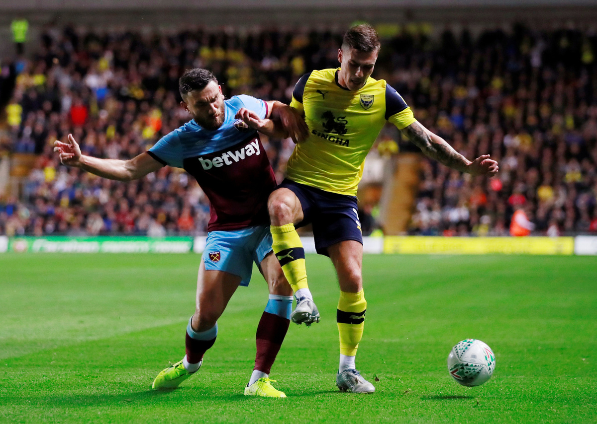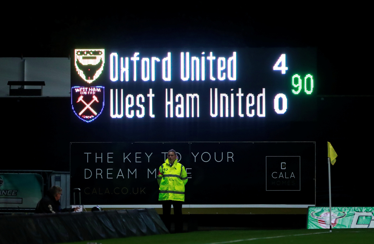 Soccer Football - Carabao Cup - Third Round - Oxford United v West Ham United - Kassam Stadium, Oxford, Britain - September 25, 2019 Oxford United's George Thorne in action with West Ham United's Pablo Fornals Action Images via Reuters/Andrew CouldridgeSoccer Football - Carabao Cup - Third Round - Oxford United v West Ham United - Kassam Stadium, Oxford, Britain - September 25, 2019 General view of the scoreboard after the match Action Images via Reuters/Andrew CouldridgeSoccer Football - Carabao Cup - Third Round - Oxford United v West Ham United - Kassam Stadium, Oxford, Britain - September 25, 2019 West Ham United's Pablo Zabaleta Action Images via Reuters/Andrew CouldridgeSoccer Football - Carabao Cup - Third Round - Oxford United v West Ham United - Kassam Stadium, Oxford, Britain - September 25, 2019 West Ham United's Robert Snodgrass in action with Oxford United's Joshua Ruffels Action Images via Reuters/Andrew CouldridgeSoccer Football - Carabao Cup - Third Round - Oxford United v West Ham United - Kassam Stadium, Oxford, Britain - September 25, 2019 West Ham United's Robert Snodgrass in action with Oxford United's Joshua Ruffels Action Images via Reuters/Andrew CouldridgeSoccer Football - Carabao Cup - Third Round - Oxford United v West Ham United - Kassam Stadium, Oxford, Britain - September 25, 2019 Oxford United's Jamie Mackie in action with West Ham United's Fabian Balbuena Action Images via Reuters/Andrew Couldridge