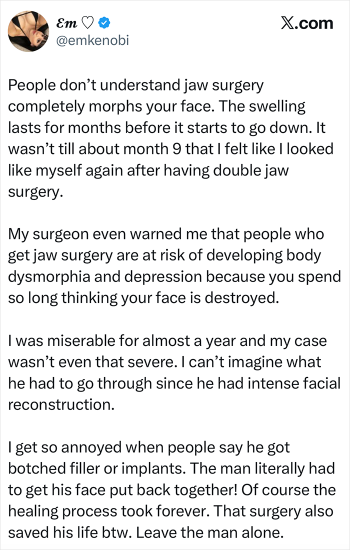 “People don’t understand that jaw surgery completely morphs your face… I get so annoyed when people say he got botched filler or implants. The man literally had to get his face put back together,” one fan wrote.