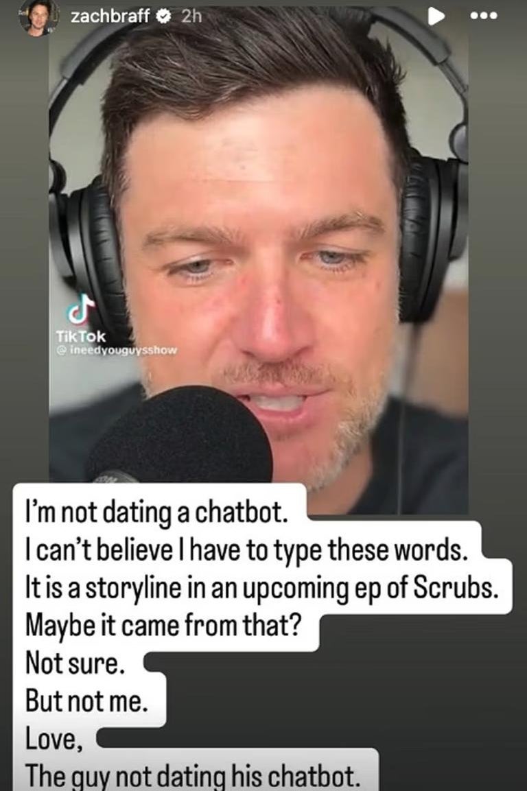 Scrubs star Zach Braff has denied he is dating an AI chatbot.