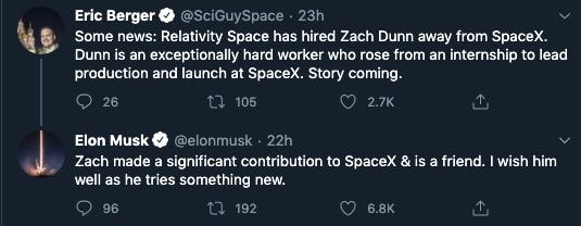 SpaceX is getting a little smaller. Zach Dunn, senior vice president of production and launch for SpaceX, is leaving the Southern California rocketry firm for another in the same area: Relativity Space. Relativity Space describes itself as the “first and only company to automate aerospace manufacturing by integrating intelligent robotics, software, and proprietary metal 3D printing technology.”