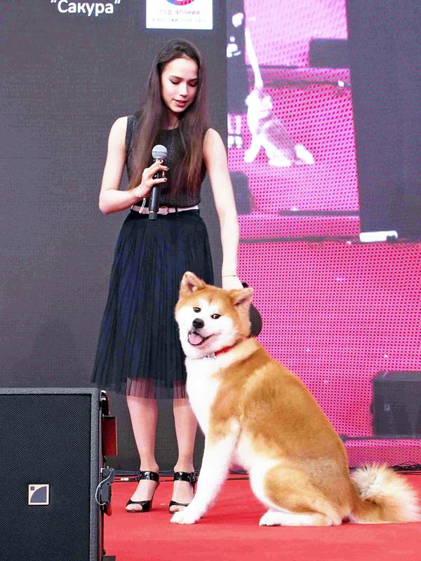 MOSCOW-- Alina Zagitova, the gold medalist in women's figure skating at the Pyeongchang Olympics last year, appeared with her Akita dog, Masaru, at an event at a shopping center in Moscow.