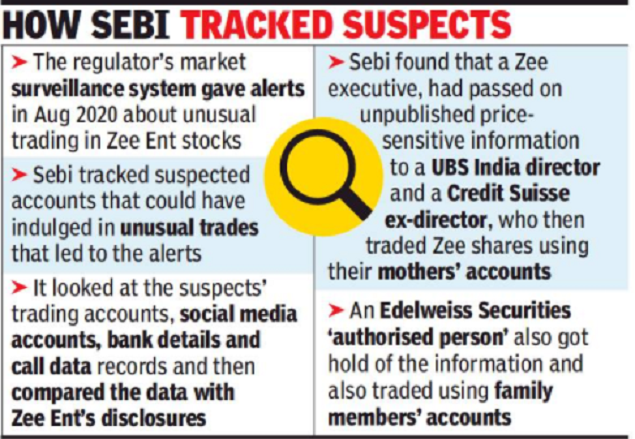 Sebi’s internal surveillance system had shown unusual price movement in the Zee stock in August last year. After an investigation, Sebi found that Bijal Shah, a top executive at Zee, had passed on information about the media company’s forthcoming results to Gopal Ritolia, a director at UBS India, and Jatin Chawla, an ex-director at Credit Suisse and currently director at First Voyagers Advisors. Based on this unpublished price-sensitive information (UPSI), Ritolia and Chawla bought large chunks of Zee shares ahead of the announcement of its quarterly and annual results. These trades were done in the accounts of their respective mothers, the Sebi report said.