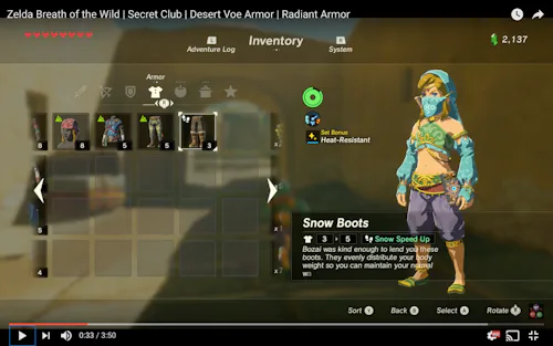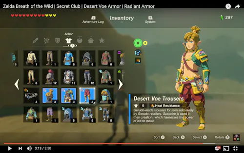 Legend of Zelda's Link spent 30 years stuck in the same green tunic (with one brief sartorial stop in an extremely good crawfish shirt in The Wind Waker). So it's no surprise that in Legend of Zelda: Breath of the Wild (BOTW), Link is really feeling his equipment oats — specifically when it comes to clothing. Some outfits give him special moves: The Zora helm grants him the spin attack, the climbing set allows him to get to otherwise unreachable heights, and the barbarian set allows him to fell his enemies more quickly in combat. But if you're heading into the Gerudo Desert's extreme heat, you'll want some BOTW heat resistance armor.