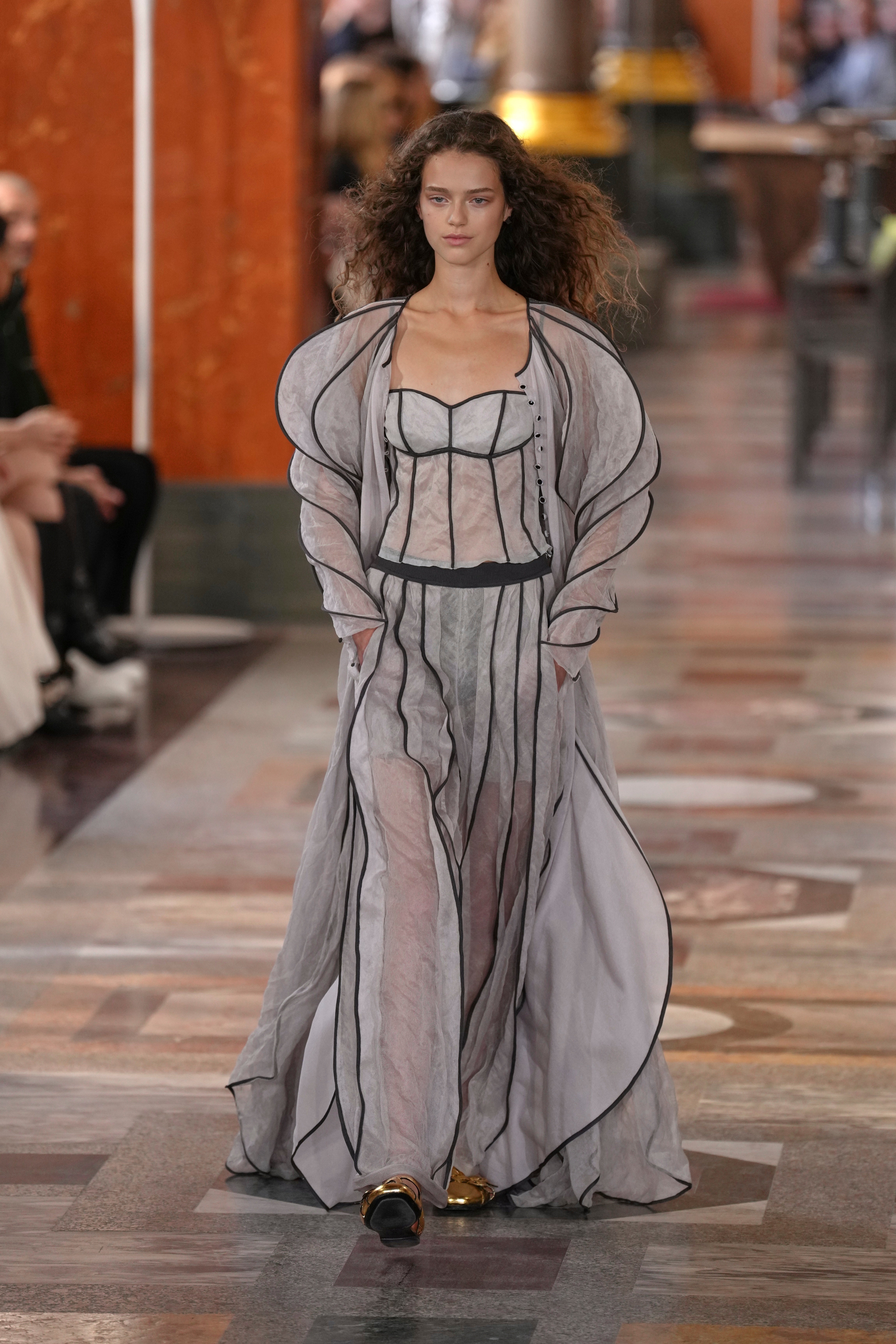 For this season, he balanced elegance with experimentation, opening with a sheer-panelled corset set, which set the tone for the collection, signalling that structure and lightness would co-exist throughout.