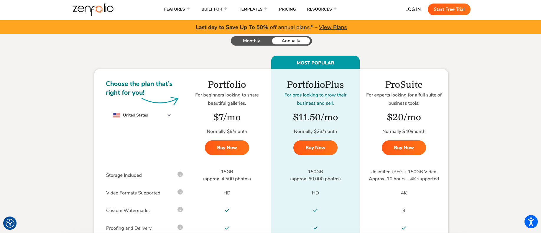 Zenfolio offers three paid plans with both monthly and annual payment options. There’s also a 14-day free trial that you can use to test the platform and get a feel for its features and tools