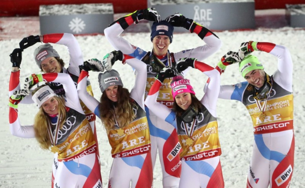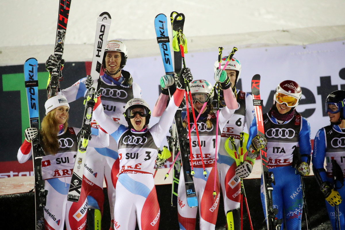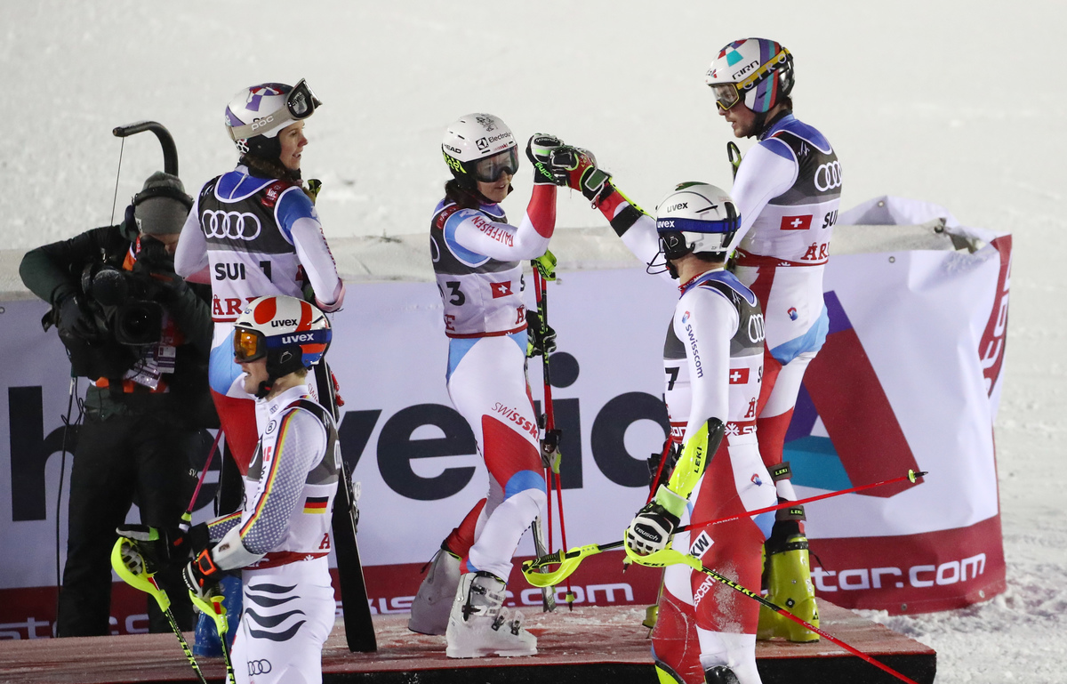 Wendy Holdener won the first leg for the Swiss by a margin of 0.28 seconds ahead of Katharina Liensberger, but the Austrians struck back with Michael Matt and Katharina Truppe taking the next two legs.