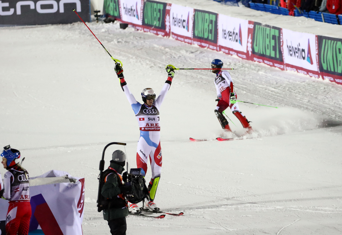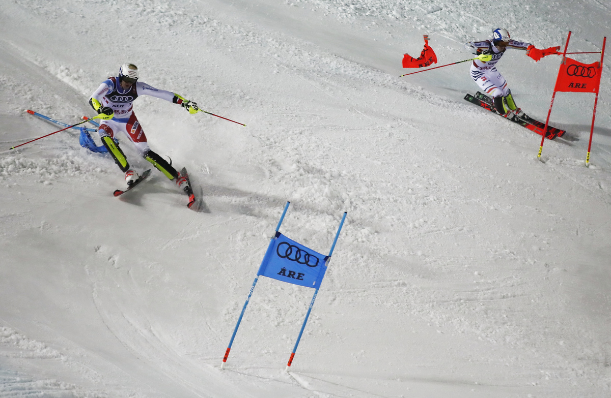Sweden's hopes of finally winning a medal at the 2019 championships fell apart in the first leg of their quarter-final against Switzerland, with Anna Swenn-Larsson clipping a gate and allowing Holdener to cruise to victory.