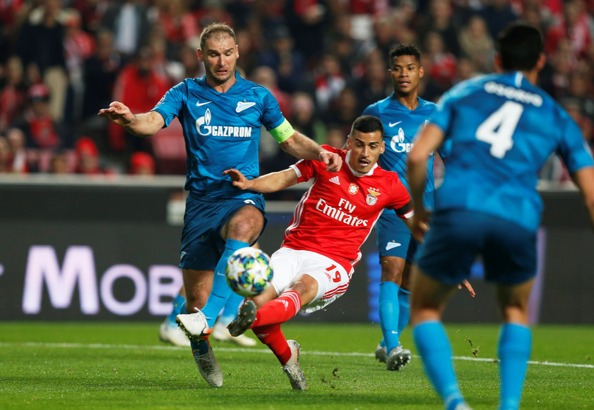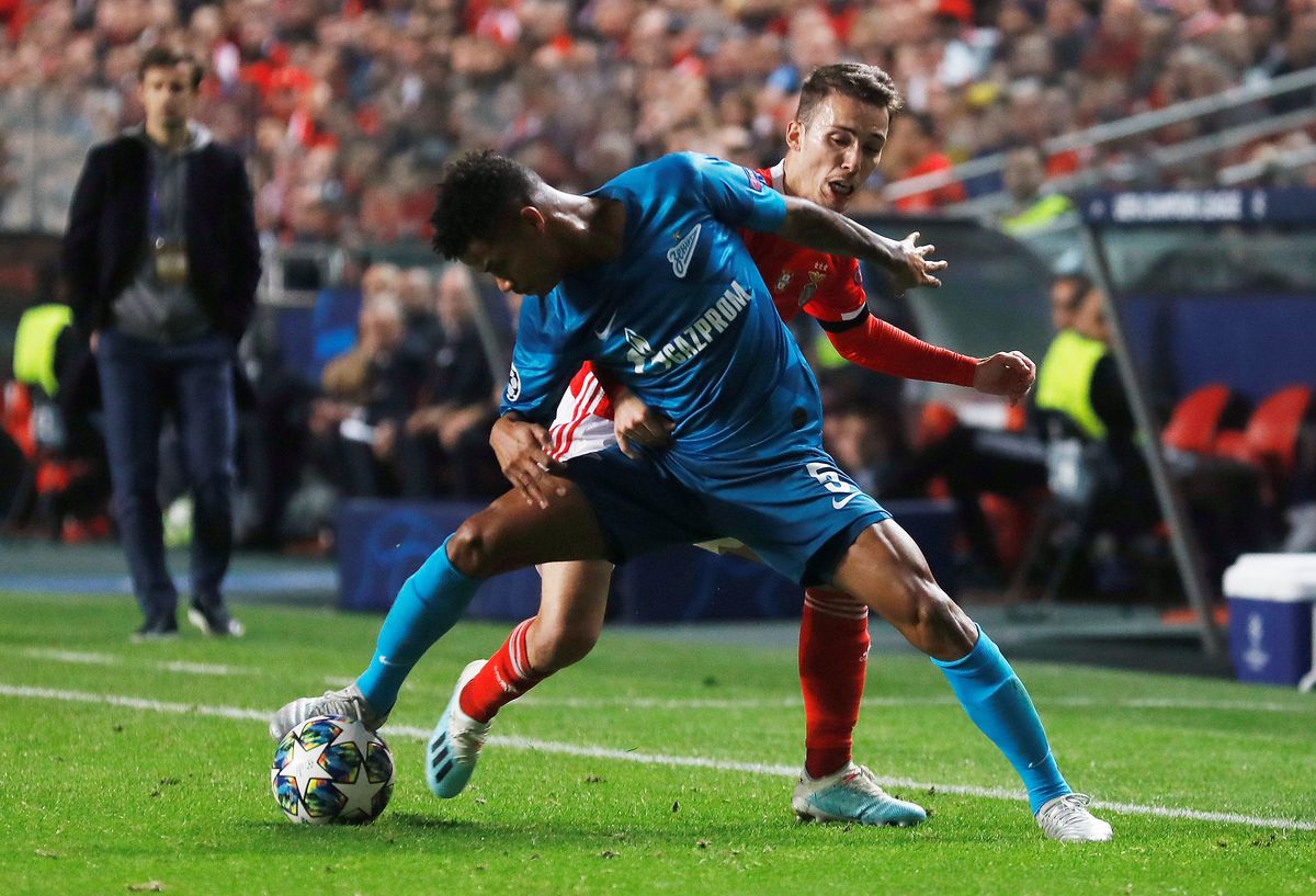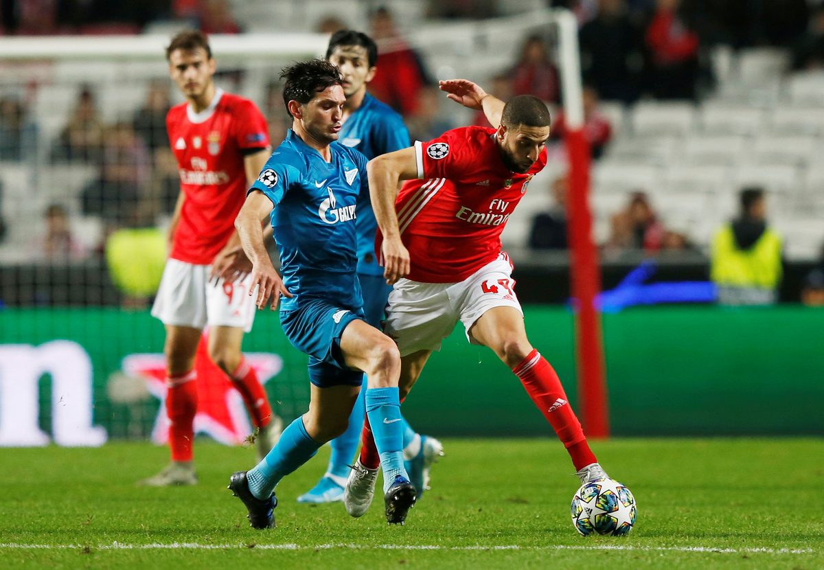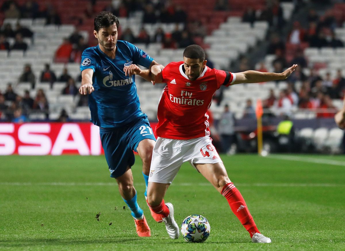 Soccer Football - Champions League - Group G - Benfica v Zenit Saint Petersburg - Estadio da Luz, Lisbon, Portugal - December 10, 2019 Benfica's Chiquinho in action with Zenit Saint Petersburg's Branislav Ivanovic REUTERS/Rafael MarchanteSoccer Football - Champions League - Group G - Benfica v Zenit Saint Petersburg - Estadio da Luz, Lisbon, Portugal - December 10, 2019 Zenit Saint Petersburg's Douglas Santos is shown a yellow card by referee Antonio Mateu Lahoz REUTERS/Rafael MarchanteSoccer Football - Champions League - Group G - Benfica v Zenit Saint Petersburg - Estadio da Luz, Lisbon, Portugal - December 10, 2019 Benfica's Adel Taarabt in action with Zenit Saint Petersburg's Aleksandr Erokhin REUTERS/Rafael MarchanteSoccer Football - Champions League - Group G - Benfica v Zenit Saint Petersburg - Estadio da Luz, Lisbon, Portugal - December 10, 2019 Benfica's Carlos Vinicius in action with Zenit Saint Petersburg's Yordan Osorio REUTERS/Rafael MarchanteSoccer Football - Champions League - Group G - Benfica v Zenit Saint Petersburg - Estadio da Luz, Lisbon, Portugal - December 10, 2019 Benfica's Adel Taarabt in action with Zenit Saint Petersburg's Magomed Ozdoev REUTERS/Rafael Marchante