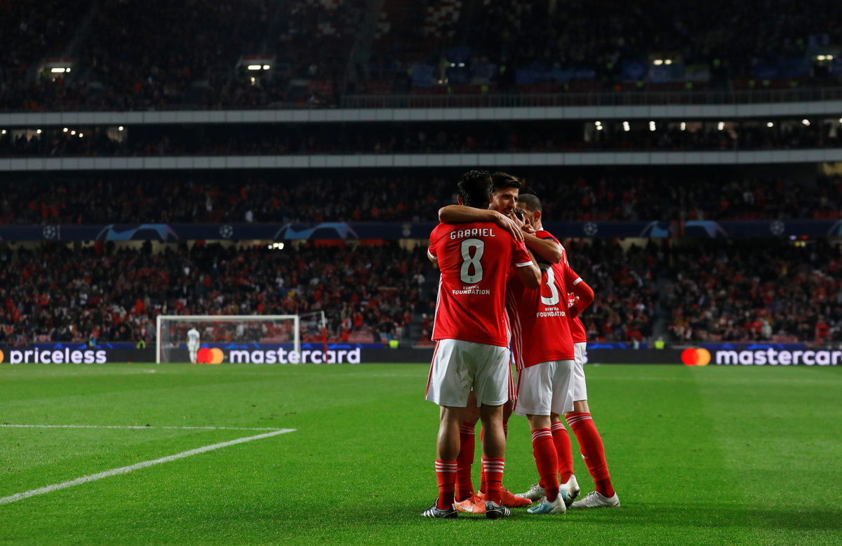 Soccer Football - Champions League - Group G - Benfica v Zenit Saint Petersburg - Estadio da Luz, Lisbon, Portugal - December 10, 2019 Benfica's Gabriel and teammates celebrate their third goal an own goal scored by Zenit Saint Petersburg's Sardar Azmoun REUTERS/Rafael Marchante