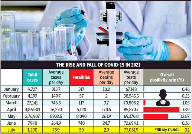 On Sunday, 71,546 tests, including 50,157 RT-PCR tests and 21,389 Rapid Antigen Tests, were conducted. On July 5, positivity rate dipped to 0.09% and, after hovering between 0.11% and 0.12% through the week, dropped to 0.07%. The overall positivity rate this month has been 0.1%, while it was 0.36% last month.