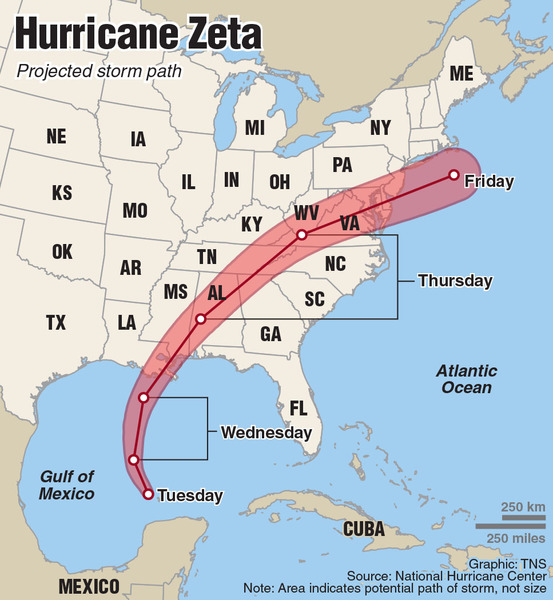 Zeta is forecast to bring hurricane and tropical-storm-force winds to the areas under hurricane and tropical storm warnings.