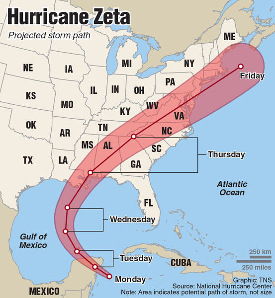 According to the projected track, the center of Zeta will then move into the southern Gulf of Mexico, where conditions are conducive for restrengthening, and make a turn to the north, forecasters said. Zeta is then expected to approach the northern Gulf Coast on Wednesday, where it is expected to make a second landfall.