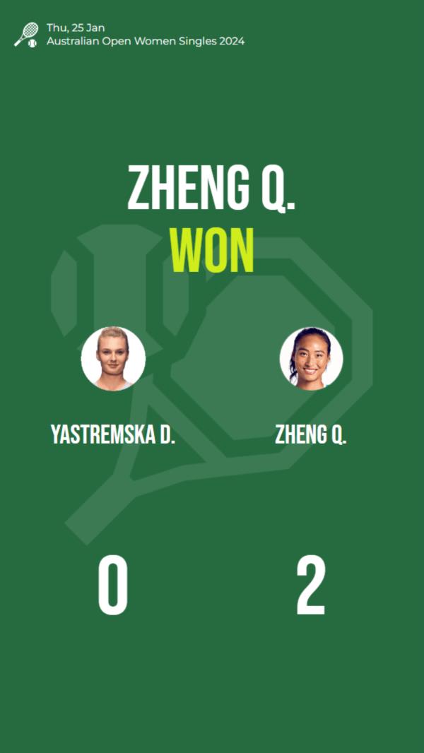 This electrifying semifinal match between Yastremska D. and Zheng Q. showcased the incredible talent, skill, and determination of these two athletes. With each player pushing themselves to the limits, the match was a display of passion and competitive spirit. Zheng Q.'s victory in this intense battle highlights her exceptional performance and places her one step closer to claiming the title at the Australian Open Women Singles 2024.